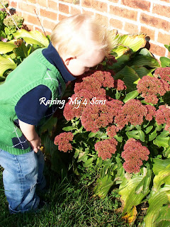 Saturday I had planned on going to the grocery store, but I just couldn’t seem to get motivated. I was really enjoying just staying around the house getting things done and getting some relaxation time. The neighbors called and invited our 3 older boys over, so they went over there to play for a few hours. It was so quiet in my house, minus the football that was on the television ALL day long! I decided after about the 2 game or maybe it was the 4th, I lost track, that I was going to do something productive (besides clean the house because one can only do so much of this before they feel they need a break.) So, the baby and I went through the closet, found him a cute outfit and I followed him around outdoors with my camera. I got a bunch of really cute pics of him. Unfortunately most of them have his face in them and I’m not able to show those to you, but I did get a few of him from behind so you can get the idea. 🙂