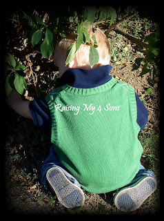 Saturday I had planned on going to the grocery store, but I just couldn’t seem to get motivated. I was really enjoying just staying around the house getting things done and getting some relaxation time. The neighbors called and invited our 3 older boys over, so they went over there to play for a few hours. It was so quiet in my house, minus the football that was on the television ALL day long! I decided after about the 2 game or maybe it was the 4th, I lost track, that I was going to do something productive (besides clean the house because one can only do so much of this before they feel they need a break.) So, the baby and I went through the closet, found him a cute outfit and I followed him around outdoors with my camera. I got a bunch of really cute pics of him. Unfortunately most of them have his face in them and I’m not able to show those to you, but I did get a few of him from behind so you can get the idea. 🙂