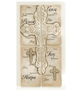We chose a very cool cross resign cross plaque that says Peace, Love, Hope and Joy on it. Not only does it match our decor wonderfully, but it is the perfect addition to our bare spot in our living room.