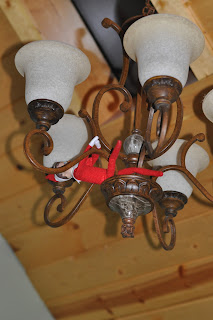 As I stated yesterday, our elf, Billy has been spotted on the Christmas tree, above a mirror in our family room, on the top of the kitchen cabinets, in the refrigerator holding a tube of cookie dough, and now today he was found swinging from a light fixture at the peak of our kitchen!
