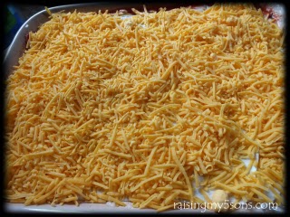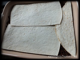 Place Seasoned Hamburger over the layer of Tortilla Shells in the casserole dish.