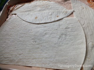 Place the second layer of Tortilla Slices on top of the Seasoned Hamburger in the casserole dish.
